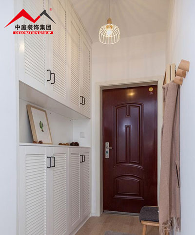 玄關,進來就如春風拂面一般清新;設計師在設計鞋柜上美觀與實用相結合,并且大大增加了儲物功能。上下兩層,不是同一個季節的鞋子可以放在上面一層好好收起來。