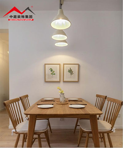 原木的家具給人很溫馨淡雅的感覺。整潔的乳膠漆沙發墻,掛上2幅簡單的裝飾畫,顯得精致又優雅舒適;