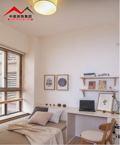 小小的書房在飄窗旁訂制了榻榻米,在美觀舒適的基礎上增加了儲物的功能。